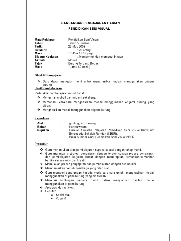 RANCANGAN PENGAJARAN HARIAN PENDIDIKAN SENI VISUAL BIL PERKARA TINDAKAN 1. RPH Pendidikan Seni Visual Tahun 5 KSSR Semakan. Rated 500 out of 5 based on 1 customer rating.